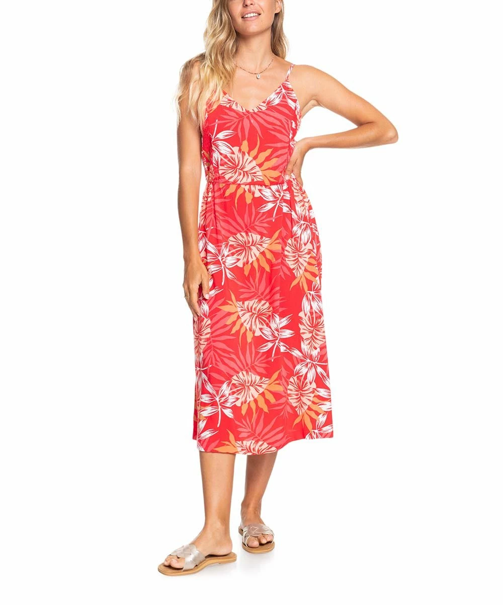 This cami-strap dress has a casual and comfortable midi length and smocked side panels for a comfortable fit. V-neckine and adjustable straps.