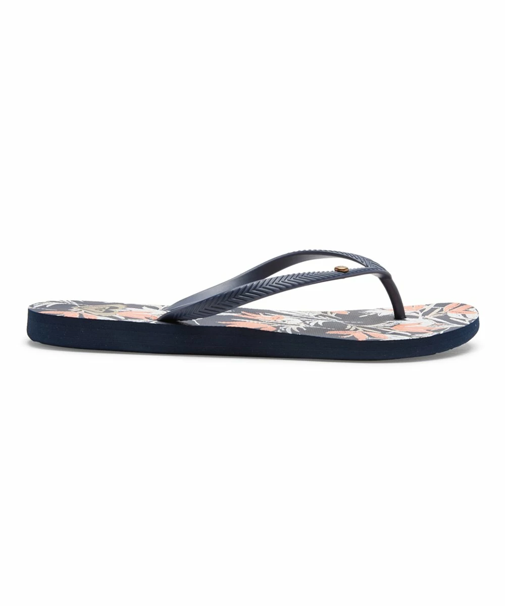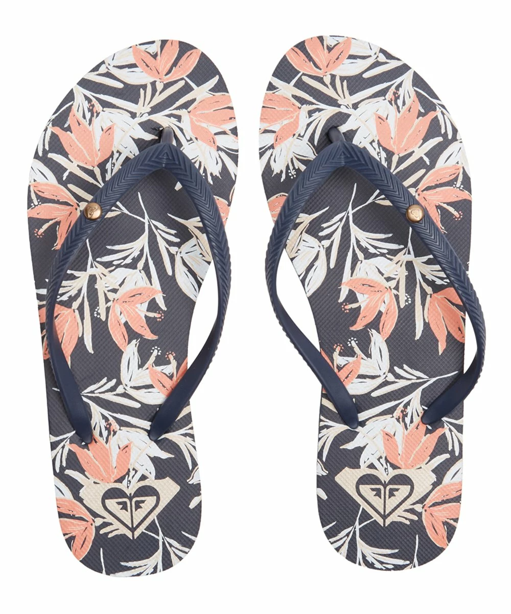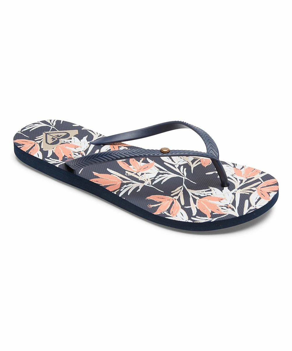 Flip-flops featuring a slip-resistant rubber sole and a bold floral print.