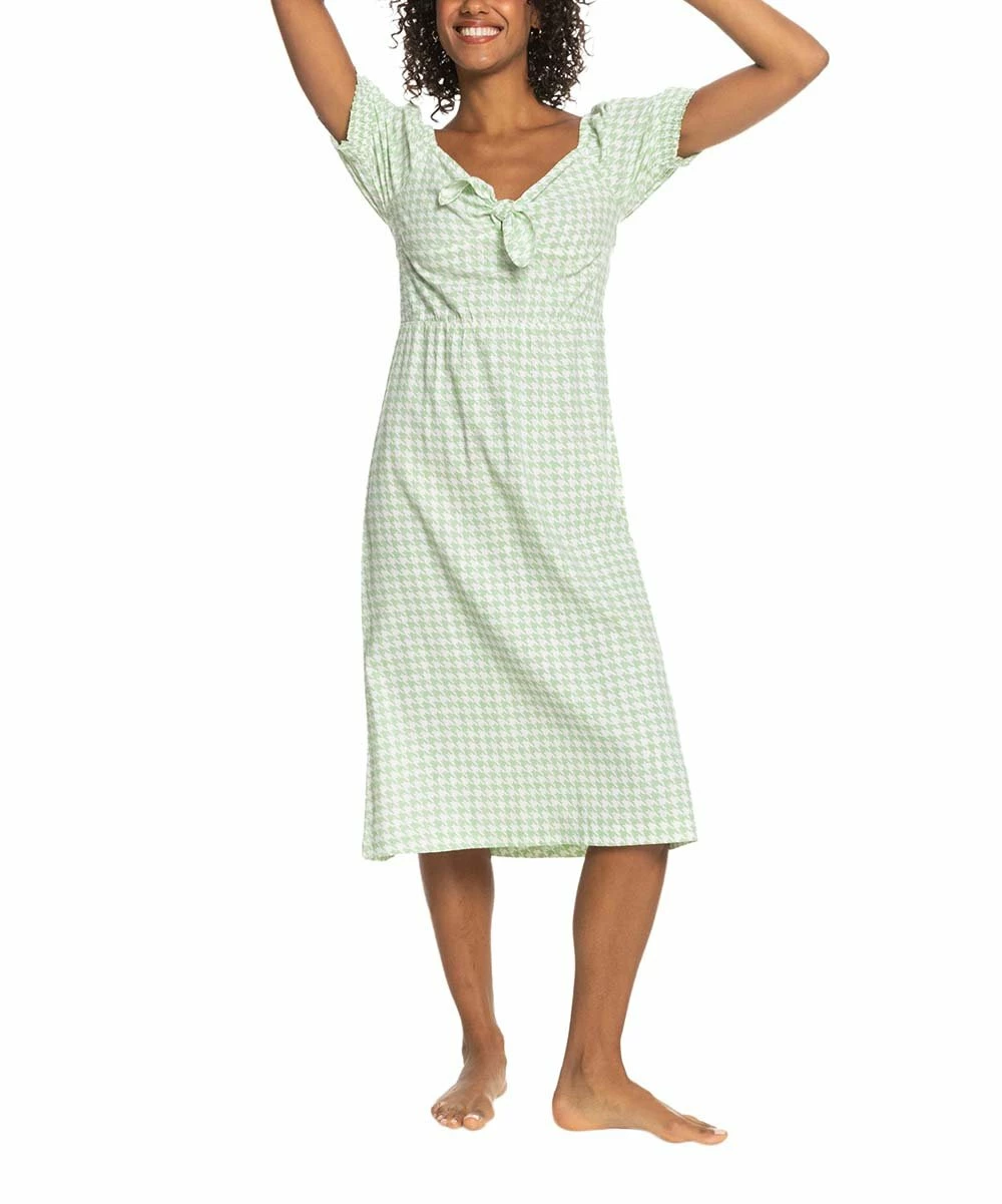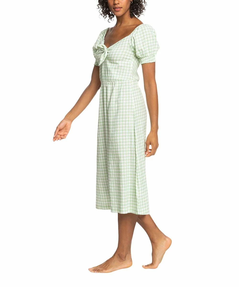 On-trend houndstooth check and a knot front give this puff-sleeve dress a casual vibe.